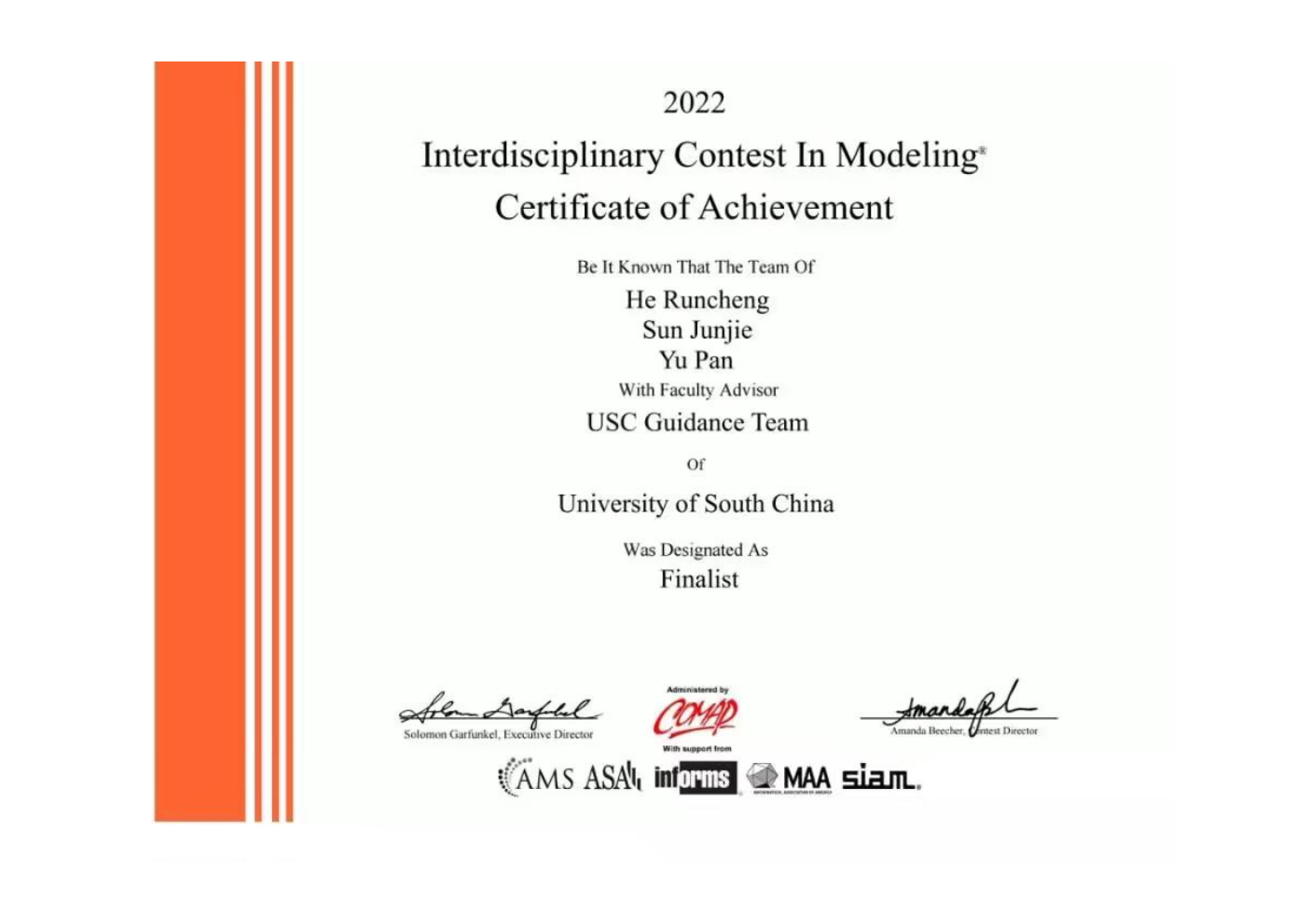 4. International level: Finalist (top 2%) in The Mathematical Contest in Modeling and The Interdisciplinary Contest in Modeling (MCM/ICM)