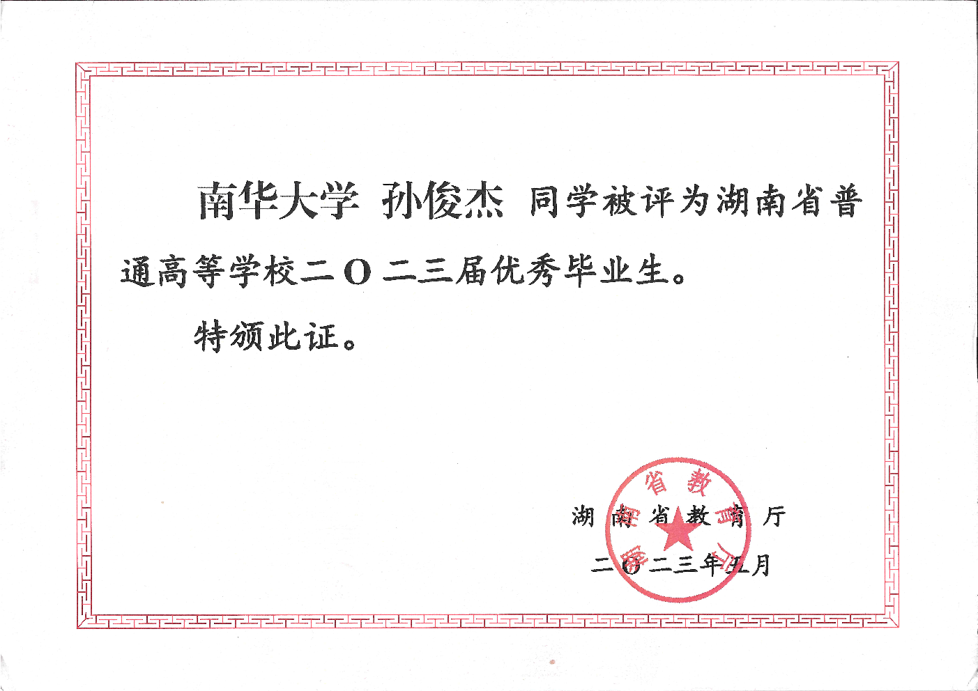 Awarded by the Department of Education of Hunan Province for outstanding academic performance, conduct, and overall excellence among graduating students.